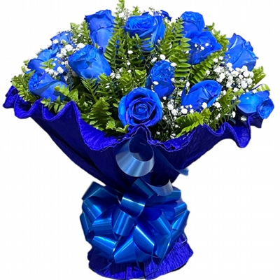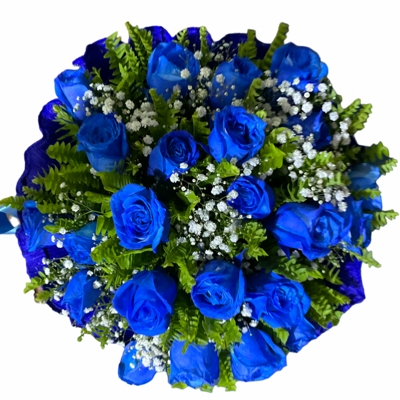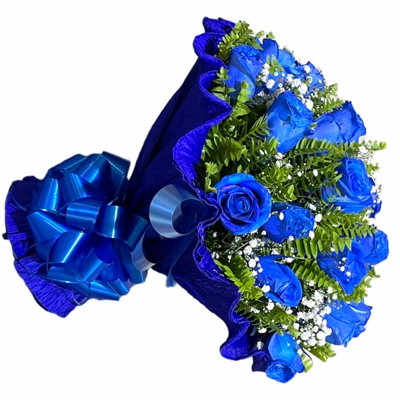Buque com 24 rosas azuis, embrulhada no crepom cm um lindo laço branco Vá ao encontro de seu amor aonde ele estiver através das flores. Torne o dia da pessoa amada incrível.