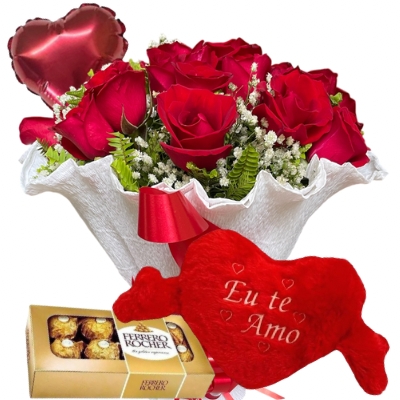 Leve sentimento e amor a pessoa amada e a surpreenda com nosso lindo buquê contendo 24 rosas vermelhas, acompanhado de uma linda pelúcia em formato de coração, mais uma caixa de ferrero rocher com 8 uni e um pick balão em formato de coração!