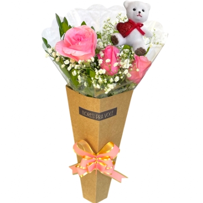 Cone com 3 rosas rosas + pick ursinho
