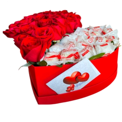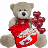 O kit é formado por uma linda caixa box em formato de coração na cor vermelha com 18 bombons de rafaello, 30 rosas vermelhas, 5 pick balões em formato de coração e um urso de pelúcia de 50cm na cor avelã super macio!